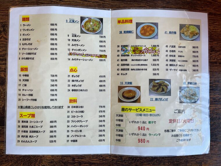 | メニュー | 【昼のサービスメニュー】 ・天津飯・中華飯・炒飯のいずれか + 餃子 940円 ・天津飯・中華飯・炒飯のいずれか + ラーメン 980円 |