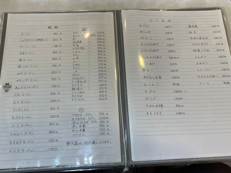| メニュー | ・日替わりランチ 850円 ・あんかけチャンポン 1,000円 ・天ぷら定食 1,800円 ・トンカツ定食 1,500円 |