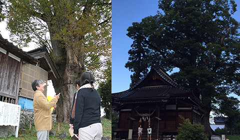 上市若杉にある日吉神社の境内に、県の天然記念物に指定されている樹高40m以上、周囲9m以上の巨樹があります。数百年前から立つこの木は、その昔、上市の市に集まる人たちの目印になっていたそうです。