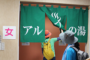 「アルプスの湯」は、上市町保健福祉総合センター(愛称:つるぎふれあい館)内にある日帰り温泉施設です。 源泉かけ流しの露天風呂、大浴場、圧注浴、寝湯、香湯、歩行浴、水風呂、サウナに加え、天然温泉に高濃度の炭酸ガスを溶かし込んだ人工炭酸浴泉が好評です。 源泉の泉質はアルカリ性単純温泉で神経痛・筋肉痛・関節痛・疲労回復などの効能があります。2階にある無料休憩所の大広間からは、雄大な剱岳を眺望することができます。 館内への飲食物の持ち込みは自由で、子供プレイルームや仮眠室もそろっています。