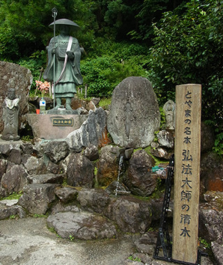 約1200年前、この地を訪れた弘法大師が水の便が悪くて苦労している住民のため、錫杖を突き立て湧き出させた水と伝わっています。飲むと頭がよくなる水として、今も多くに人に親しまれています。