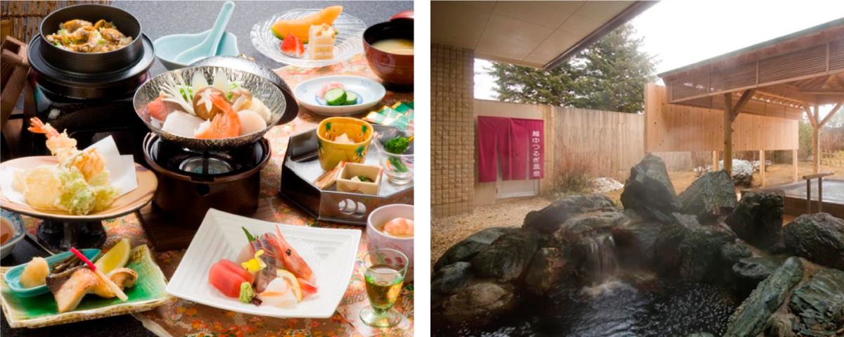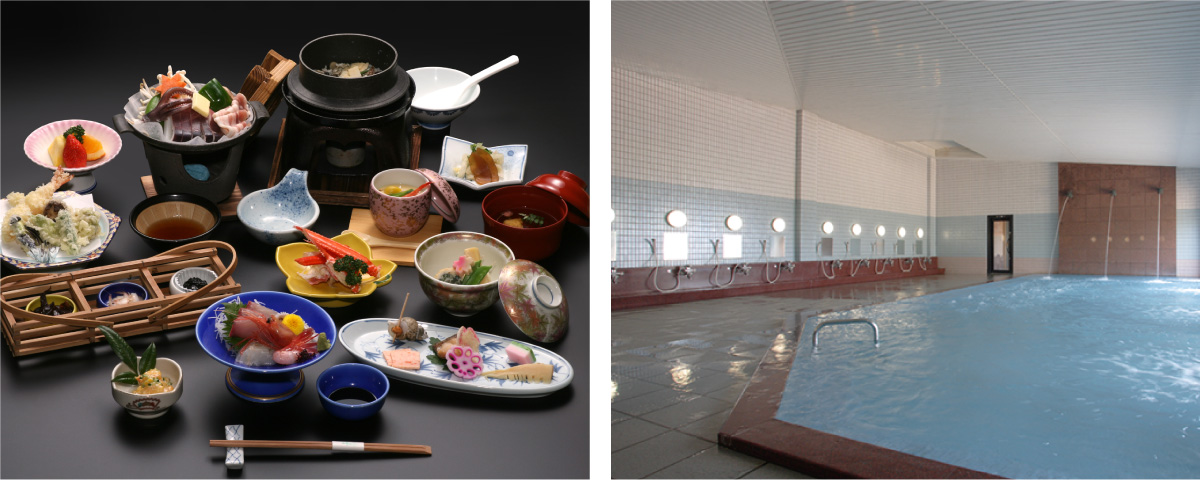 美肌効果の高い天然温泉は大浴場だけでなく、家族風呂や温泉付き客室でも楽しめる。「とやま食の匠」が作り出す料理も魅力。