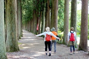 眼目山立山寺の境内からスタート。参道に立ち並ぶ樹齢数百年のトガ並木をのんびり歩きます。樹木に触れて自然の息吹を感じたり、木漏れ日を感じながら寝転んだりして、ゆったりと癒しのシャワーを浴びましょう。起伏が少ないので、体力に自信のない方や年配の方、車椅子の方におすすめです。